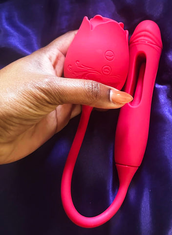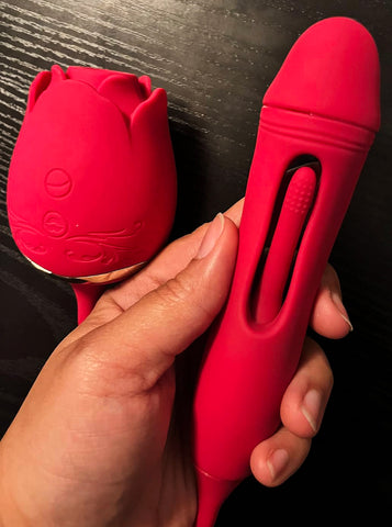 The rose toy itself is surprisingly substantial. That is to say it sucks a bit larger of an area than the satisfyer which is actually much more comfortable, and the modes on it are legitimately amazing. It's a solid toy even if you only use the rose by itself (which I often do). However the dildo provides an insane amount of extra simulation. The finger thingamabob is soft silicone, not rigid, so it's a nice amount of sensation without being too harsh and the size of it is perfect. It's not so large that it's uncomfortable or detracts from the rose if you choose to use them together, while still being enough to provide a delicious layer of stimulation. Solid 5/5 for me--------------------LaceyReviewed in the United States on November 4, 2023With the rose toy You no longer need a partner. Lol this thing does it all. I had fun with my partner and playing alone. So many different things you can do with this rose vibrator. The speeds are just right and the battery lasted about 4 hours before it needed a charge. The sucking vibrator is a great toy.