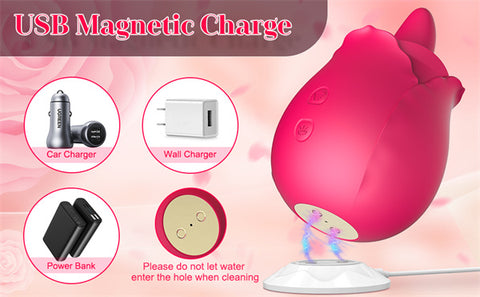 - USB Magnetic Charging & IPX6 Waterproof - The product uses a magnetic charging chassis to connect and charge, to achieve a tighter connection and fast charging. There are vent holes at the bottom of the rose toy, the rose vibrator is not allowed to be immersed in water, please avoid water entering the bottom hole when cleaning.