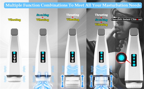 - 【Blended Sex - "One-click" Button Takes You into Climax Instantly】-Combined with rapid thrust, suction, and intense vibration, the one-click button can plug your little guy into the climax excitement. Rapid thrust accompanied by sucking, then following some pumps or contractions, a feeling of contentment and bliss will raise from the loins up all over the body. Of course, you can train your sex endurance by alternating between normal modes and one-click climax mode.