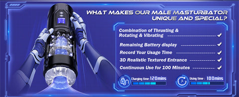 - 【Male Sex Toys with LCD Screen】- Our sex toy design with LCD digital display, in addition to displaying rotating & thrusting mode and vibrating mode, it also adds usage time and remaining power, this is a technological improvement that differentiates our sex toys from other male masturbator. Super battery life make you enjoy up to 100 minutes of sex toys for men on a 120-minute charge.